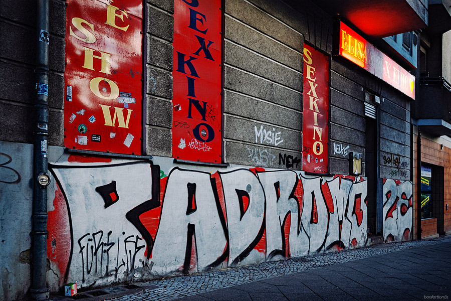 Seit 1899 gibt es Lichtspieltheater mit erotischem Programmschwerpunkt in Berlin. Spätestens seit sich bewegte Bilder jedes nur erdenklichen unkeuschen Inhalts per Mausblick auf den Monitor im stillen Kämmerlein zaubern lassen, stehen Etablissements dieser Art auf der Roten Liste (der vom Aussterben bedrohten Spezies). Allen Widrigkeiten zum Trotz öffnet diese einschlägige Filmbühne in der Wilmersdorfer Blissestraße bis heute ihre Pforte. Möglicherweise sind die unzweideutige Signalfarbe und das gepflegte Schmuddelimage die Bringer.