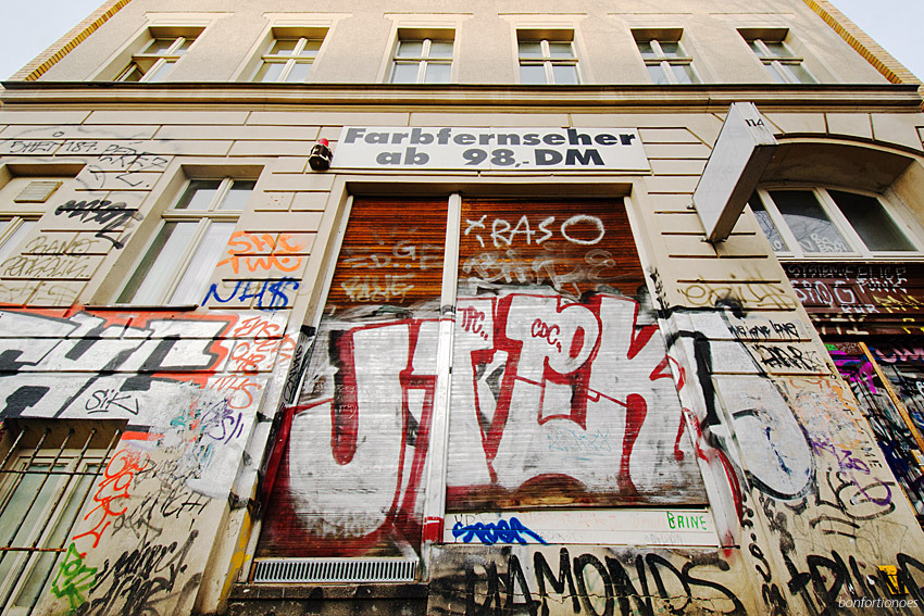 … gab es noch eine Währung ohne Rettungsschirm und man holte sich Elektrogeräte nicht nur per Super-Mega-Brüller-Kredit im interstellaren Blödmarkt. Man hielt noch D-Mark in der Hand und ging zum Händler nebenan. Von unersättlichen Jägern unerbittlich verfolgt sind beide mittlerweile (fast) ausgestorben. Wie ein seltenes Fossil mutet daher diese Gebäudefront in der Skalitzer Straße an und weckt noch einmal Erinnerungen an jenes Land vor unserer Zeit.