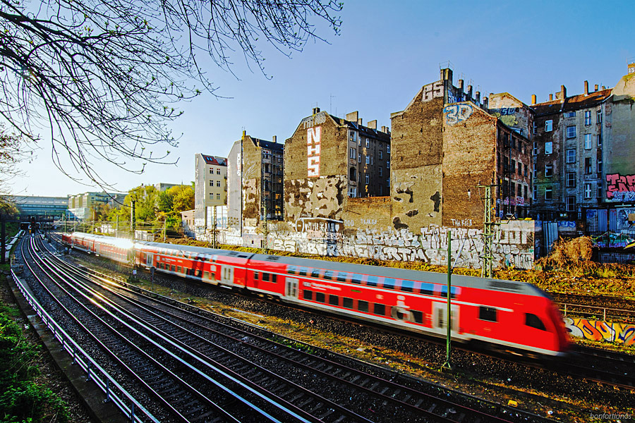 Hochbetrieb auf der Stadtbahn, rollendes Material in Kältestarre auf dem Talgo-Gelände. Aufgenommen von der Warschauer Brücke gen Osten.