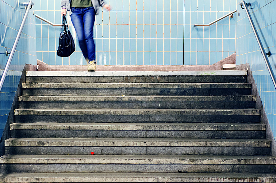 Eine U-Bahn wartet nicht. Da rettet nur ein kleiner Spurt vor dem unfreiwilligen Zurückbleiben an der Bahnsteigkante. Fotografiert am Abgang von der U3 im U-Bahnhof Spichernstraße.