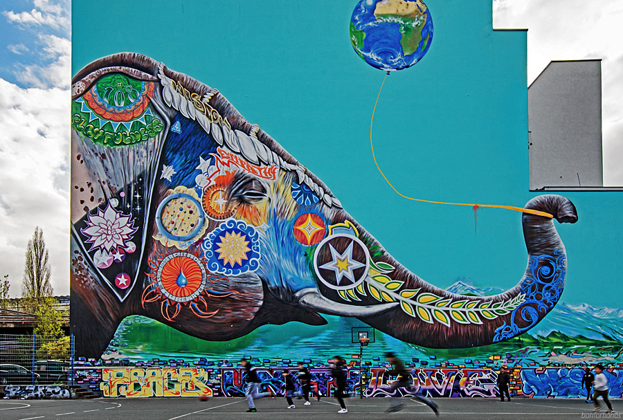 Im Schatten eines mit dem Weltenball spielenden Dickhäuters jagen Kreuzberger Kids ihrem Fußball hinterher. Das farbenfrohe Rüsseltier pinselte der französisch-kolumbianische Künstler Jadore Tong auf die Rückseite eines Wohnhauses in der Kreuzberger Wilhelmstraße.