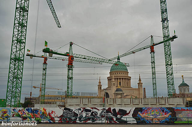 Wie ein Rudel Wölfe hat die Kranenmeute ihr Opfer umzingelt. Haben sie es auf die grünlich schimmernde Kuppel abgesehen? Eisernen Tentakeln gleich scheint Ausleger um Ausleger nach der gewölbten Kirchenkrone zu greifen. Doch die Potsdamer St. Nikolai-Kirche hat nichts zu befürchten. Die einbeinigen Gewichtheber im Eiffel-Kostüm interessieren sich nicht für den einst von Schinkel entworfenen Sakralbau. Vielmehr sind sie vollauf damit beschäftigt, dabei zu helfen, dass der brandenburgische Landtag sich bald im feudalen Schlossgewand zeigen kann.