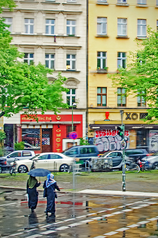 Szene am Heinrichplatz in Kreuzberg bei Schmuddelwetter, fotografiert durch die regennasse Frontscheibe im Oberdeck eines BVG-Busses auf der Linie M29.