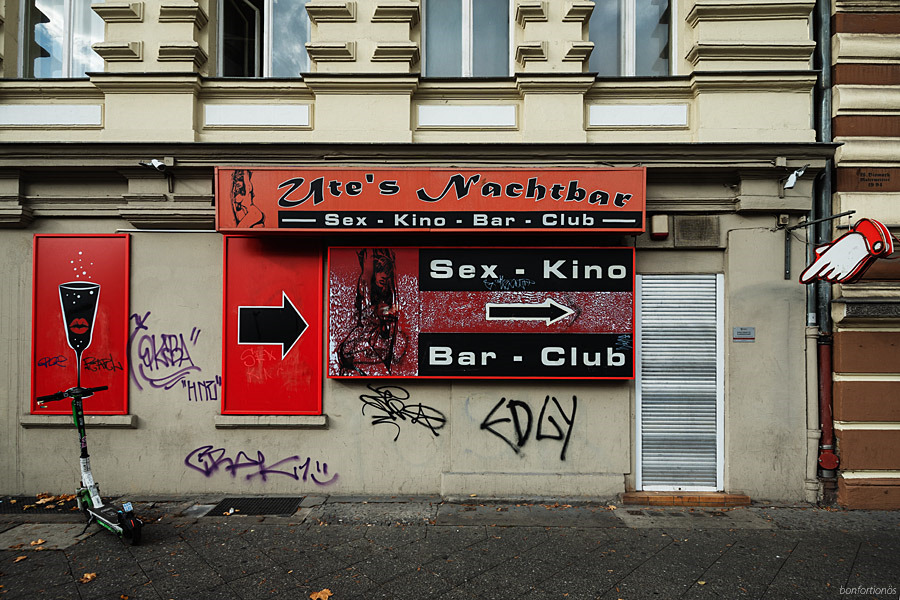 Seit 1899 gibt es Lichtspieltheater mit erotischem Programmschwerpunkt in Berlin. Spätestens seit sich bewegte Bilder jedes nur erdenklichen unkeuschen Inhalts per Mausblick auf den Monitor im stillen Kämmerlein zaubern lassen, stehen Etablissements dieser Art auf der Roten Liste (der vom Aussterben bedrohten Spezies). Allen Widrigkeiten zum Trotz öffnet diese einschlägige Filmbühne in der Wilmersdorfer Blissestraße bis heute ihre Pforte. Möglicherweise sind die unzweideutige Signalfarbe und das gepflegte Schmuddelimage die Bringer.