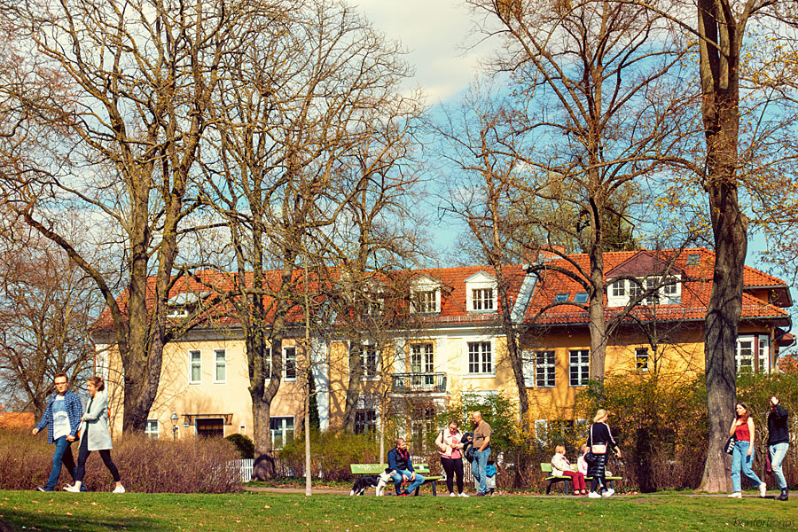 Sonntägliches Flanieren und Plauschen bei wohliger Frühlingssonne auf dem Dahlemer Kaiser-Wilhelm-Platz.