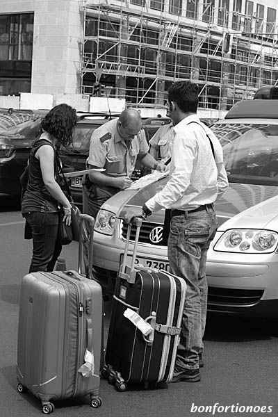Plötzlich ist er da, der Retter in der Not. Farbstilistisch vielleicht etwas eigensinnig, denn seine beige-grüner Tracht passt nicht so richtig zum silber-blau-gestreiftem Automobil. Aber er hat eine Karte und weiß wo es lang geht. Er führt die verirrten Seelen mit ihrer schweren Last zurück auf den rechten Pfad. Die gute Tat des Tages habe ich an der Kreuzung Joachimstaler Straße/Kantstraße aufgenommen.