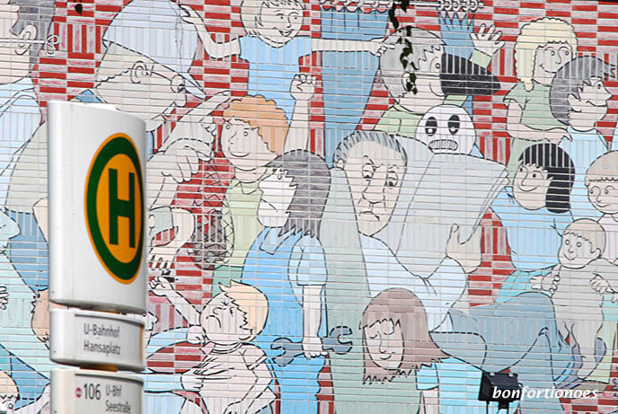 /0 Kommentare/in gebautes, straßenkunst /von Sven HochTobende und raufende Kinder, ein grimmiger Zeitungsleser, der von einem Gespenst gestört wird, überdimensionale Pappnasen und Oberlehrer mit Bauarbeiterhelm. Das Grips-Theater im Berliner Hansaviertel ist nicht nur sehenswert wegen seines berühmten Musicals „Linie 1“, dass Berliner und Berlinerinnen inklusiver der berüchtigten Wilmersdorfer Witwen haarscharf porträtiert, sondern auch wegen seiner Südfassade. Mit seinem riesigen Wandmosaik aus bemalten Fliesen nimmt Rainer Hachfeld dort das Verhältnis von kleinen und großen Leuten auf´s Korn.