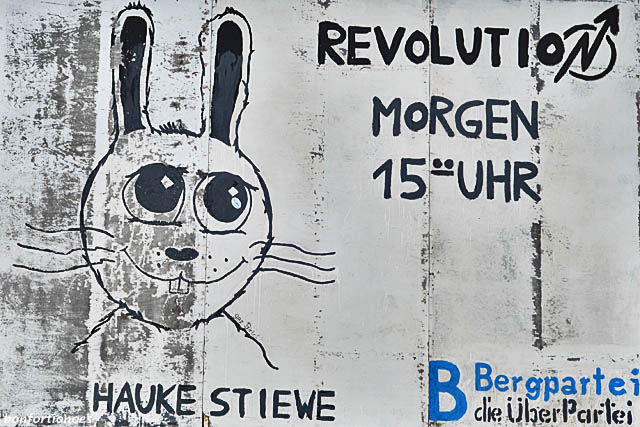 Langohrenviagra – kostenlos und auf Rezept – scheint das Hauptanliegen der fusionierten Berg- und Überpartei bei der Wahl am Sonntag zu sein. Oder wie sonst soll man sich den leicht meschuggen Gesichtsausdruck des kleinen Hasens (oder ist es ein großes Karnickel?) namens Hauke erklären, der für diese Gruppierung in Lichtenberg kandidiert. Überhaupt seltsam, dieses Rammler-Outfit. Denn eigentlich ist Hauke Stiewe in seinem Revier (bzw. Wahlkreis) eher als „linker Hund“ denn als Hasenfuß bekannt. Sein Wahlplakat, das ich am Frankfurter Tor fotographiert habe, läßt allerdings auch andere Interpretationen zu.