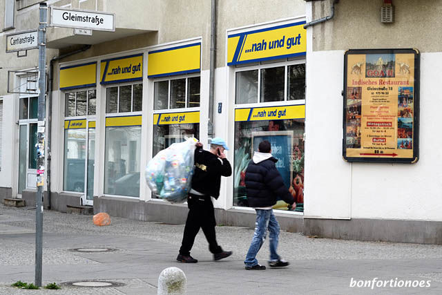 Das Geschäft mit recyclebaren Rohstoffen boomt. Auch ein riesiger Sack mit leeren PET-Flaschen ist da bares Geld wert. Da die Pfandkurse für die Plastikbuddeln allerdings kaum kurzfristigen Preisschwankungen unterliegen, glaube ich nicht, dass die Jungs gerade mit ihrem Broker telefonieren. Eher debattieren sie darüber, wie sie die Erlöse für ihre Pullen reinvestieren. Denn Cash winkt: der Supermarkt an der Ecke ist nah und gut.