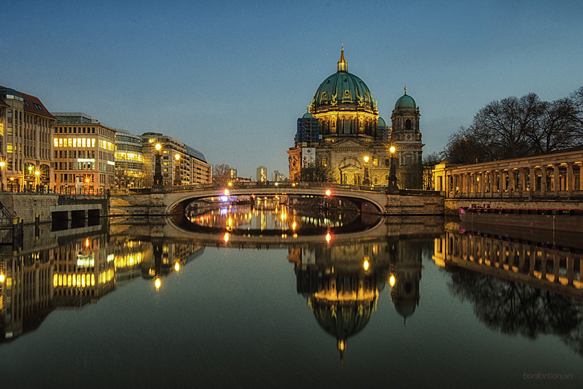 Das Herz Berlins schillert an und in der Spree: der Dom und die Friedrichsbrücke in Mitte.