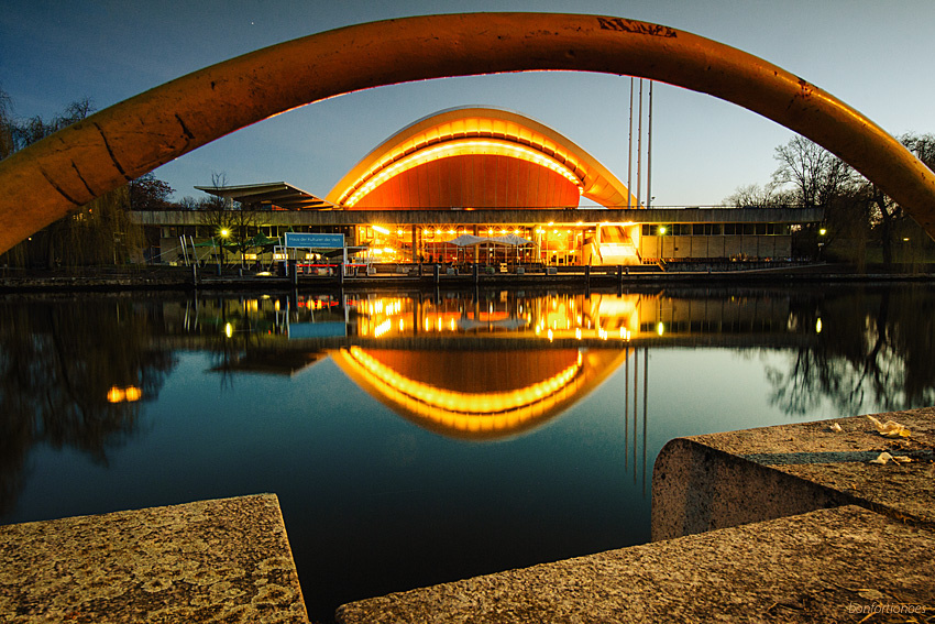 Unter dem Abendstern Sirius (ja, er ist oben links zu erkennen) haben die bereits im Nachtgewand erscheinende „Schwangere Auster“ und ihr Spreespiegel an einem klaren, kalten Spätwinterabend (oder wahlweise auch Frühfrühlingsabend) einen schillernden Auftritt.