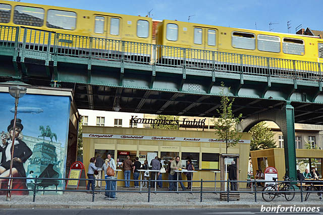 Unter dem frisch sanierten Hochbahnviadukt glänzt auch die Reinkarnation der legendären Currywurstgarerbude Konopke´s. Irgendwie fehlt beiden ein wenig jene altehrwürdige Patina (dem Viadukt und der Imbißbude, nicht der Wurst), die dem Straßenbild dort, wo Schönhauser-, Kastanien- und Pappelallee sowie Danziger und Eberswalder Straße zusammentreffen, stets seinen typischen, leicht morbiden Charme verliehen hatte. Ob die Wurst noch genauso gut ist wie früher habe ich noch nicht getestet. Wird aber bald nachgeholt!
