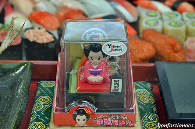 Nicht auf der Hutablage eines Opel, sondern in einer Vitrine an der Hardenbergstraße habe ich die Bekanntschaft dieser fernöstlichen Lady gemacht. Während ihr kurz- und vierbeiniger Pendant im Auto beim Bewachen der Klopapierrolle unterm gehäkeltem Überzug von einem Nicktick heimgesucht wurde, macht diese japanische Geisha made in China mit sanften Bewegungen Publicity für eine Sushi Bar. Die Nigiri-, Maki-, Gunkanmaki-, Chirashi- oder Oshi-Sushi, die es dort zu speisen gibt, wurden gleich im dauerfrischen plastilinen Zustand appetitlich um die zarte Verführerin herum angerichtet.