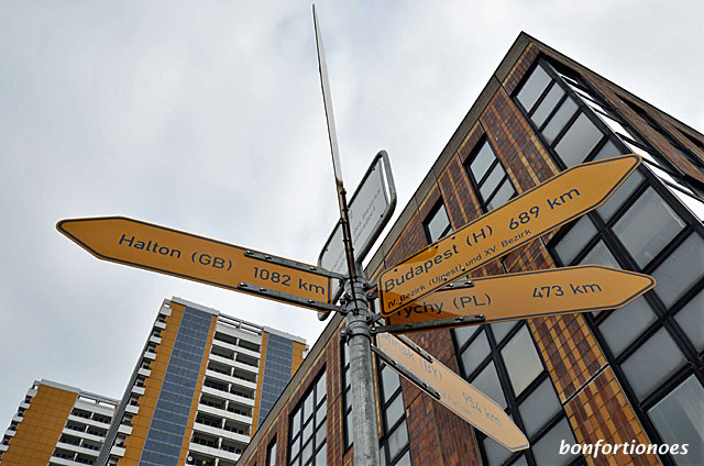 Schon gewusst? Orte aus nahezu allen Himmelsrichtungen fühlen sich mit Marzahn tatsächlich partnerschaftlich verbunden. Darauf macht dieser sternförmige Wegweiser vor dem Rathaus am Helene-Weigel-Platz aufmerksam.