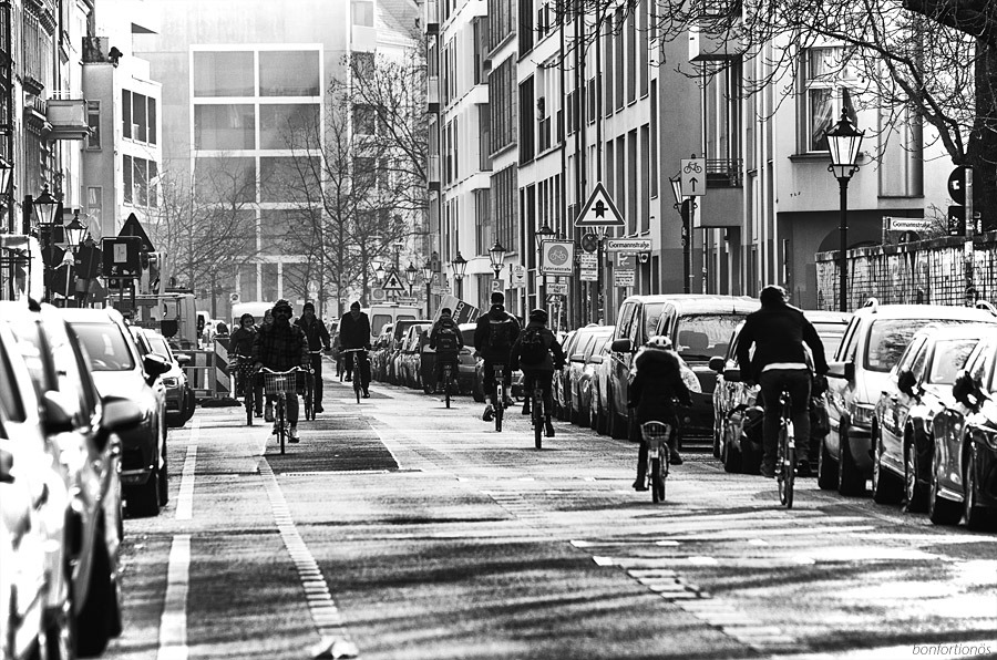 Zweiradkarawanen während der morgendlichen „rush hour“ in der Linienstraße in Mitte.