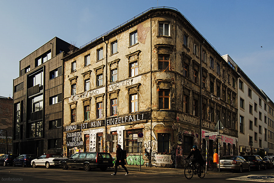 Eine der Ikonen der linksextremen Berliner Hausbesetzerszene, das Eckhaus Linienstraße 206, eingerahmt von stylisch sterilen Gentrifizierungstreibern wie z.B. dem „Schwarzen Haus“ links in der Kleinen Rosenthaler Straße.