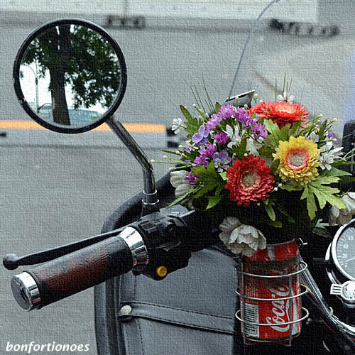 Entweder ist es die Coffein-Dröhnung aus der Cola-Büchse oder die geballte Kraft des 75 PS starken 1100-Kubik-Zweitakters, die diesen Strauß so richtig sprießen läßt. Die Honda-GL1100-Maschine ist schon ein echter Klassiker, mit diesem bunten Blumenarrangement allerdings bildet das Motorrad ein im wahrsten Sinne des Wortes merkwürdiges Gespann. Das coole Stillleben habe ich auf dem Kudamm gesehen.