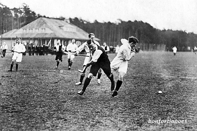 Eine entscheidener Moment im Wett-Hockeyspiel zwischen Berlin und München. Das am 28. Dezember 1913 ausgetragene Match zwischen Pruzzen und Bajuwaren endete schiedlich friedlich 2:2 unentschieden. Auf Berliner Seite kämpfte auch der Preußen-Prinz Sigismund - mit sicher ebenso perfekt gezogenem und gegeltem Scheitel wie bei zwei der drei Sportkameraden in der Mitte des Fotos.