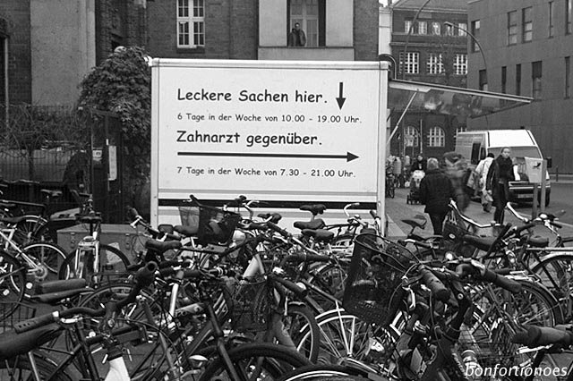 Prophylaktische Warnung oder gezielte Verlockung, den bitteren Gang anschließend mit etwas Köstlichem versüßen zu können? Auf jeden Fall haben Lebensmittelhändler und Dentalmediziner hier ihre Angebote erstklassig miteinander verzahnt. Gesehen am S-Bahnhof Pankow und ausnahmsweise einmal mit dem Telefon fotografiert.