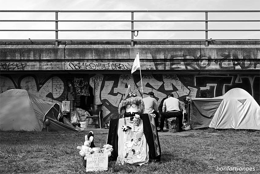 Ergänzend zum gestrigen Post noch ein weiteres kreatives „Anpumpwerk“ im Niemandsland zwischen Stadtbahn, Zoologischem Garten und Tiergarten. Da wird um eine Spende für „Schule und Essen“ gebeten. Wer im Vorbeigehen seinen Beitrag abführt, unterstützt damit direkt die in den Zelten im Hintergrund lebenden Menschen. Das sind fast ausschließlich Männer zumeist mittleren Alters, deren Deutschkenntnisse äußerst rudimentär erscheinen. (Weiter-)Bildung wäre daher besonders angesagt!