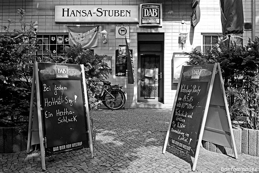 Eigentlich hätten die Hansa-Stuben solche Reklame überhaupt nicht nötig, wird hier doch im Gegensatz zu den umliegenden Schänken echtes Dortmunder Bräu gezapft. Als ich heute vorbeikam, machte ich allerdings auf der Schwelle kehrt: der Gastraum war wieder gerammelt voll von Fanatikern in blau-weiß-gestreiftem Outfit. Der Berliner Club spielte gerade in Dortmund auf verlorenem Posten. Das köstliche DAB wollte ich mir da nicht durch die triste Stimmung der Herthaner verderben lassen.
