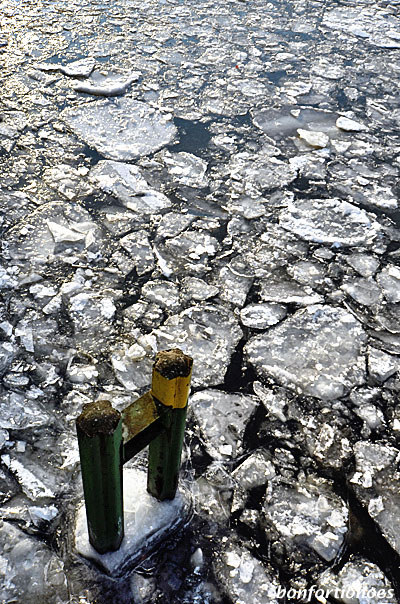 Eis schließt die rostigen Reste eines Schiffes im Berliner Osthafen ein. Das Wrack könnte von Tragödien erzählen. Der Eigner nannte es nach seiner tödlich verunglückten Frau. In den Nachwendezeiten schipperte die nobel ausgebaute „Dr. Ingrid Wengler“ Passagiere über die Wasserstraßen Brandenburgs und Europas. Bis ein Berliner Wasser- und Schifffahrtsamt nach Streit mit dem Eigner das Schiff in den Osthafen schleppen ließ und – so liest man – es seinem Schicksal überliess. Ein nicht geschlossenes Ventil und im Winter platzende Leitungen beschädigten das Schiff, die in Berlin überall heimischen Vandalen taten das ihrige. Nun vollendet der Zahn der Zeit stetig und unerbittlich das Zerstörungswerk.