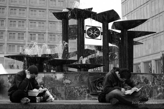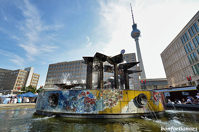 Irgendwie unwirklich flimmert das Spiegelbild dieses Keramikbild in den riesigen Panoramascheiben des frisch sanierten „Appartment-Hauses für Gäste der DDR-Regierung“ am Schloßpark in Pankow. Obwohl über allem ein Gockel trohnt, bestimmen die vier Naturelemente das Kunstwerk. Folgerichtige nannte DDR-Staatskünstler Walter Womacka seine Arbeit „Erde, Wasser, Feuer, Luft“. Angesichts der damals erwarteten Staatsgäste verzichtete Honeckers Lieblingsmaler hier auf die für ihn so typische Darstellungsweise und Symbolik des sozialistischen Realismus. Kaum zu glauben übrigens, dass die Restauratoren das riesige Wandbild wieder so hingekriegt haben: vor wenigen Monaten war es noch nahezu vollständig mit Graffiti bedeckt.