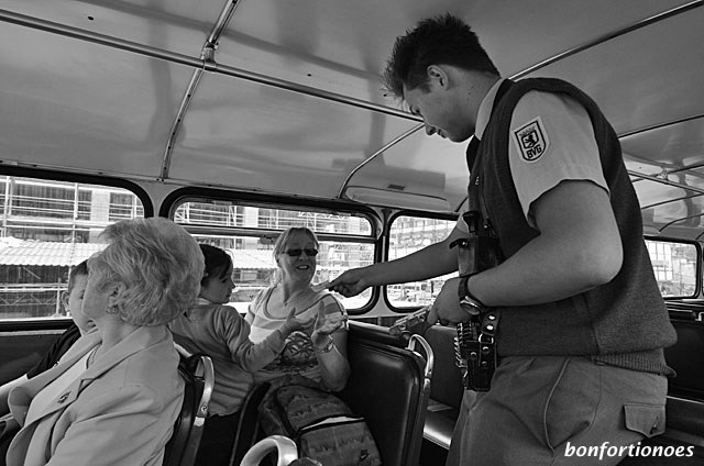 Berliner Busfahr-Feeling wie einst im erstaunlich sanften 1974er Büssing-DE-Doppeldecker. Natürlich mit Fahrscheinkauf direkt beim BVG-Schaffner, der die Münzen in Windeseile seinem auf Euro-Geld geeichten Galoppwechsler einverleibte. (Als Galoppwechsler werden spezielle Münzspeicher bezeichnet. Sie bestehen meistens aus fünf bis sieben Röhren mit unterschiedlichem, an das jeweilige Münzgeld angepasstem Durchmesser. Früher gehörten sie zur Standardausrüstung jedes Eisen- und Straßenbahnschaffners.)