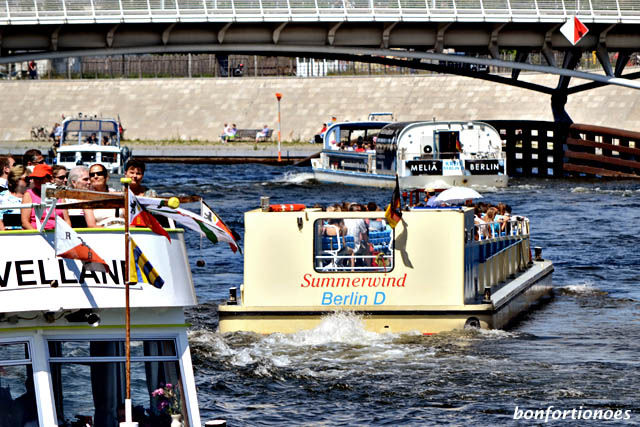Viel los auf der Spree zwischen Reichstag und Hauptbahnof. Sobald die Sonne ein wenig lacht, schippert eine Armada von Ausflugsbooten unzählige Touristen aus aller Herren Länder durchs das historische Zentrum und das Regierungsviertel. Selbst an Bord solch unförmiger Kähne wie der ‚Summerwind‘ finden sich da noch genug zahlende Passagiere ein.