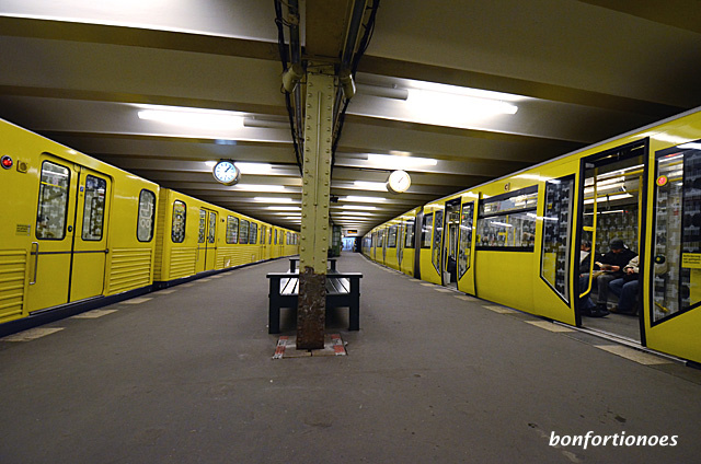 Im legendären Grips-Musical präferierten die berüchtigten Wilmersdorfer Witwen und ihre Mitfahrer in der „Linie 1“ das Springer-Revolver-Blatt „BZ“ als U-Bahn-Lektüre. Wer im echten Leben nicht gerade auf seinem Smartphone rumhämmert verkürzt sich die Fahrzeit in den orangegelben Zügen mittlerweile oft lieber mit dem Lesen ganzer Bücher – wie dieser Fahrgast hier. Gesehen im U-Bahnhof „Hausvogteiplatz“ (Berlin-Mitte).